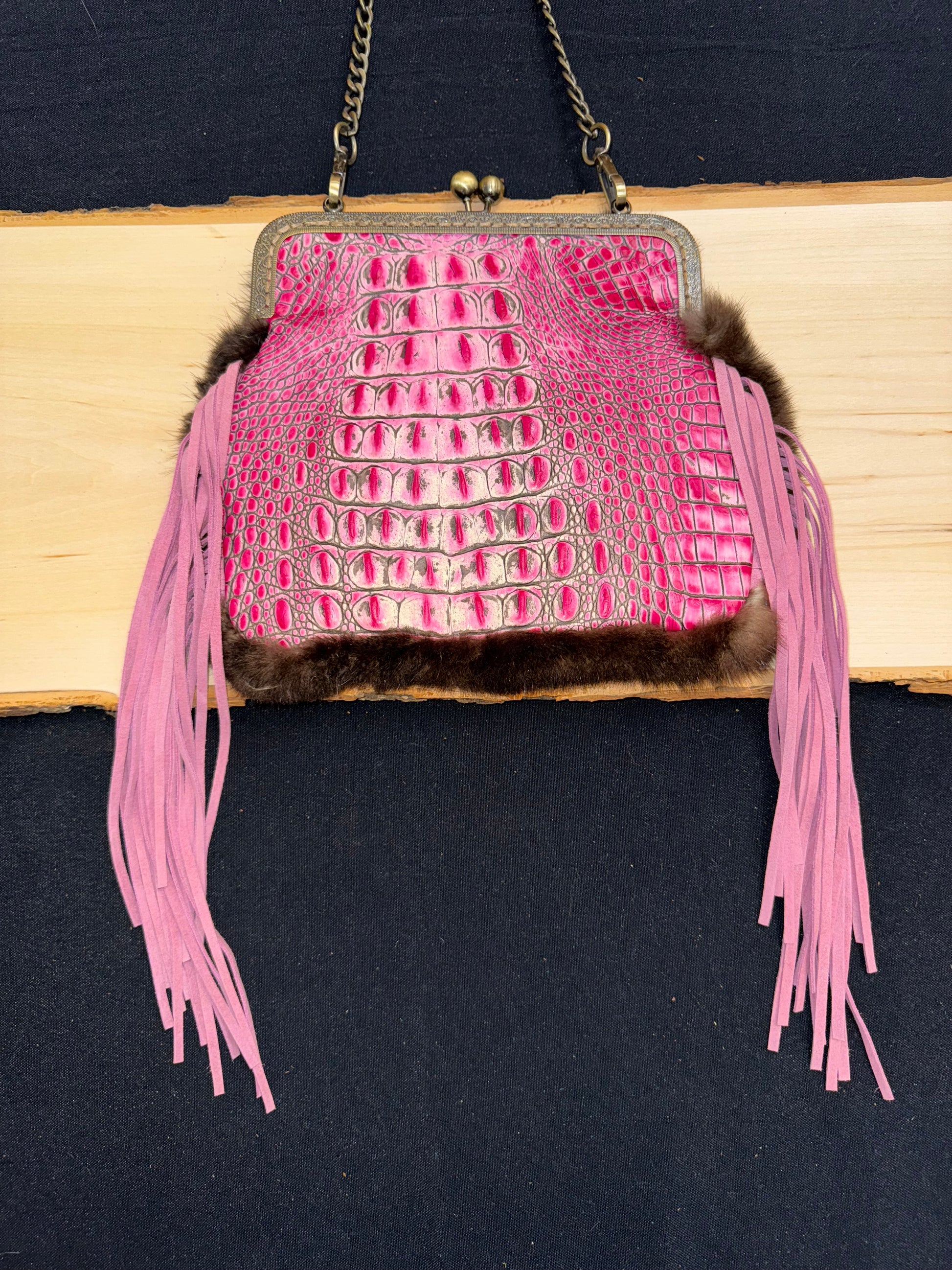 This vibrant design pairs pink crocodile-embossed leather with genuine sea otter fur, creating a luxurious, double-sided statement piece. Finished with pink suede fringe and a 42” crossbody chain, it combines playful color with timeless craftsmanship.