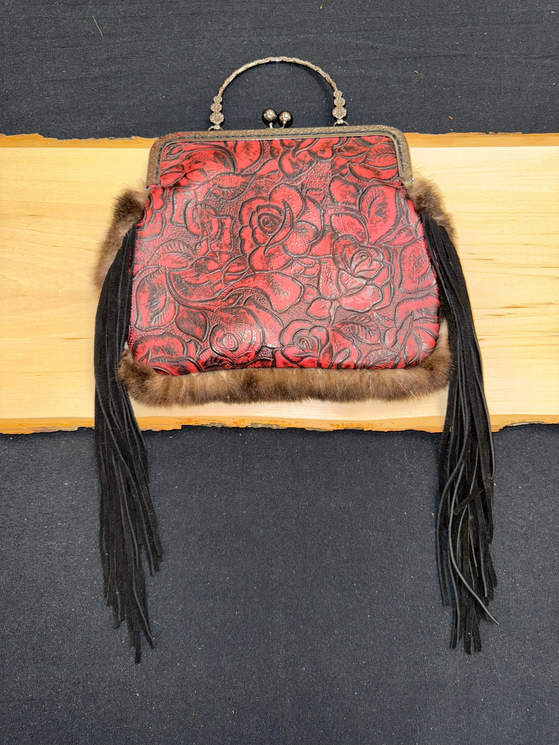 This purse combines deep red rose-embossed leather with plush sea otter fur, creating a tactile, elegant piece. Finished with black suede fringe, an antique-style handle, and a 42” crossbody chain, it brings together tradition, romance, and fine craftsmanship.